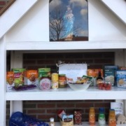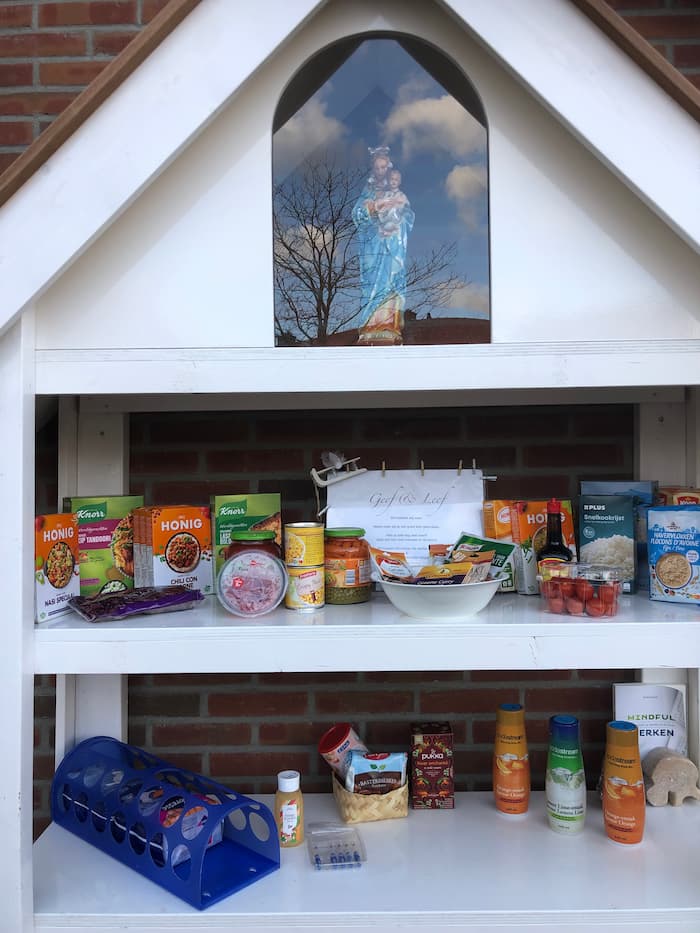 Maria, als symbool van de voedende moeder. Althans voor mij want ik ben niet religieus en ook zo min mogelijk spiritueel maar ik geloof wel in eten en drinken voor iedereen. Daarom deel ik via deze kast wat ik over heb en het leuke is dat dit heel goed aanslaat in mijn diverse arbeiderswijk in het Gooise Bussum. Er wordt enorm veel geruild en gebruikt. Samen komen we de winter zo door en delen we met elkaar.