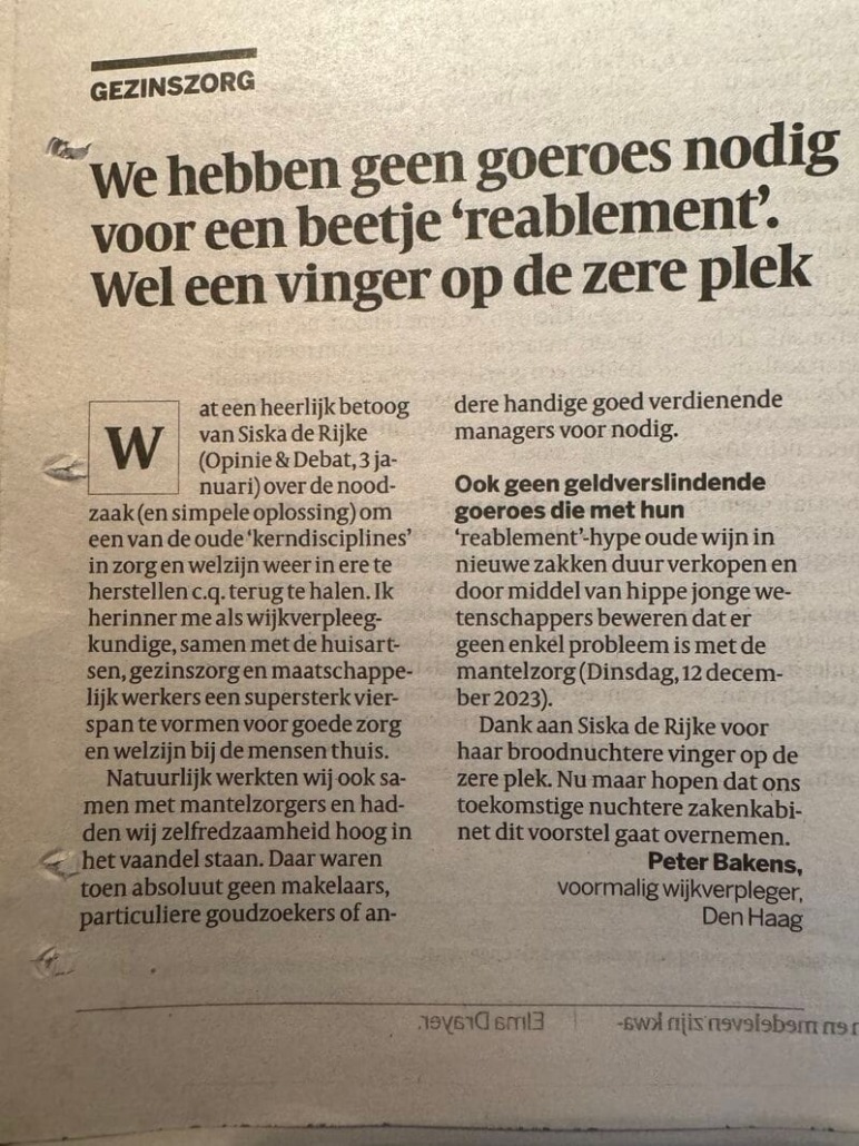 Als zorgprofessional met een schat aan ervaring en kennis laat ik mij mijn hele loopbaan regelmatig horen. En daar ben ik gelukkig niet alleen in. Steeds vaker lees, hoor of zie je bijdragen van verpleegkundigen en verzorgenden. Het is nodig want in de zorgwereld zijn helaas ook veel mensen actief die geen kennis en ervaring hebben in de zorg. Het zijn de mensen met de zelf verklaarde goede ideeën. Al is die kwalificatie vaak niet gebaseerd op wetenschap of consensus. Vaak wordt het idee vooral goed verkocht en geframed door degene die het idee bedacht heeft. Al heb ik mij voor groot deel uit het publieke debat teruggetrokken en heb ik geen vaste functie meer in de openbare bestuur/beleidswereld, ik blijf mij regelmatig geroepen voelen. Zoals toen eind 2023 een “mantelzorgmakelaar” in de Volkskrant voorstelde om het budget van kraamzorg over te hevelen naar haar beroepsgroep zodat zij de vrijwilligers die nu als buddy mantelzorgers ondersteunen een vergoeding kon geven. Tot nu toe wordt namelijk alleen de mantelzorgmakelaar (flink) betaald door zorgverzekeraars( aanvullend pakket), gemeenten( projecten tegen overbelasting van mantelzorgers en tegen eenzaamheid) of door mensen zelf. Ik vind en vond daar wat van. En besloot een opiniestuk “terug te schrijven”. Tot mijn vreugde heeft de Volkskrant begin 2024 mijn reactie geplaatst. Natuurlijk ben je dan trots.